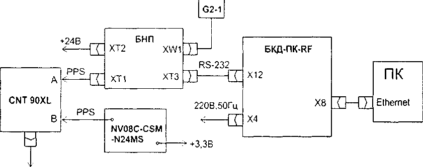 Подключить блок БНП к порту XI2 блока БКД-ПК-RF при помощи интерфейсного кабеля, входящего в комплект поставки. Подключить к разъему ХТ2 блока БНП источник постоянного напряжения 24 В при токе до 0,1 А. Подключить к разъему XW1 блока БНП лист № 7 Всего листов 8 внешнюю активную антенну G2-1. Блок БКД-ПК-RF (разъем Х8) необходимо подключить к ПК при помощи интерфейсного кабеля Ethernet, входящего в комплект поставки. Подать напряжение питания 220 В, 50 Гц на разъем Х4 блока БКД-ПК-RF. Проверить наличие свечения индикатора «Питание» на блоках БКД-ПК-RF и БНП. Антенна БНП должна располагаться в зоне приема сигналов спутников ГЛОНАСС/GPS. Дождаться мигания зеленого индикатора на блоке БНП, означающего готовность выходных данных.