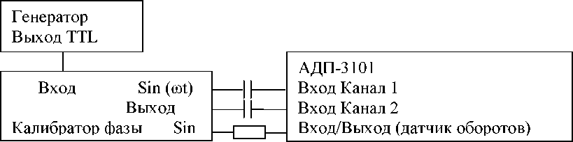 - одного - напряжением TTL-уровня и частотами 5, 50, 100, 200 Гц, подаваемого с калибратора фазы через преобразователь “синус-импульс” на универсальный вход/выход прибора;