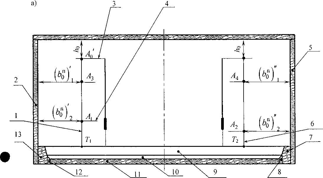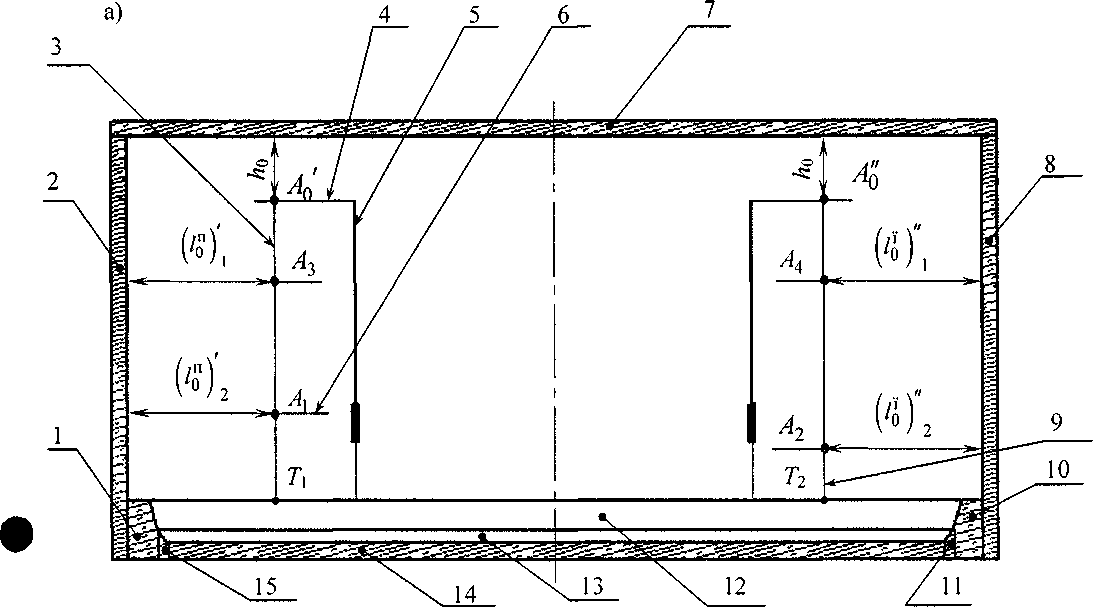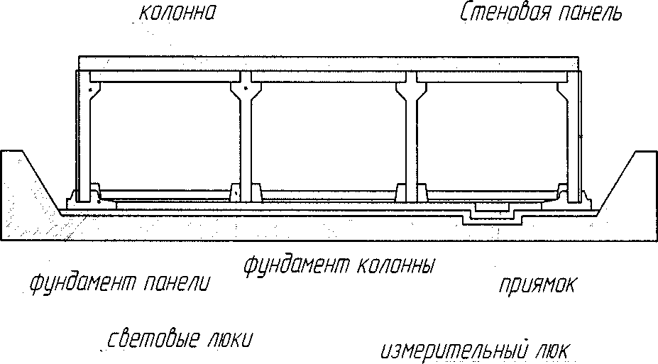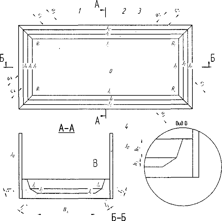3.1 резервуар железобетонный прямоугольный: Сосуд железобетонный (см. рисунок 1), состоящий из верхней части в виде прямоугольного параллелепипеда, состоящего из прямоугольных вертикальных и поперечных стенок и нижней части в виде корытообразной формы, образованной из двух параллельных горизонтальных верхнего и нижнего прямоугольников (при этом нижний прямоугольник является днищем резервуара) и двух поперечных наклонных трапеций, применяемый для хранения и измерения объема и массы мазута.