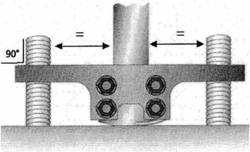 8.3.4 Затягивайте гайки равномерно и постепенно, датчик должен быть прижат таким образом, чтобы шпильки удерживающего устройства располагались перпендикулярно основанию датчика, а расстояние между шпильками и датчиком слева и справа были одинаковое (рисунок 2).