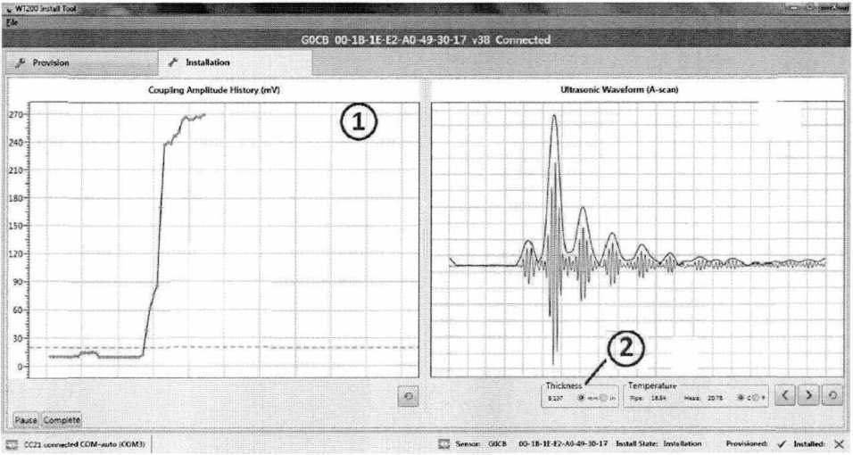 8.3.6 Анализируя показания программного обеспечения WT200, убедитесь, что уровень амплитуды находится между значениями 240 и 270 mV (обозначение «1», рисунок 3), а единицы измеряемой толщины установлены в положение «мм» (обозначение «2», рисунок 3). Если уровень амплитуды не достигает 240 mV, подтяните гайки.