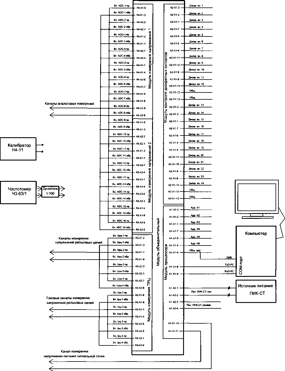 Для канала измерения напряжения питания сигнальной точки определение относительной погрешности измерения СКЗ напряжения проводится для трех значений напряжения в диапазоне от 80 до 250 В. Для канала измерения напряжения питания сигнальной точки определение относительной погрешности измерения частоты напряжения проводится для трех значений частоты в диапазоне от 45 до 55 Гц. Для каналов аналоговых измерений определение относительной погрешности измерения СКЗ проводиться для пяти значений напряжения в диапазоне от 1 до 250 В. Для каналов измерения напряжений в рельсовых цепях определение относительной погрешности измерения СКЗ напряжения проводиться для пяти значений напряжения в диапазоне от 1 до 27 В. Для каналов токовых каналов измерения напряжений в рельсовых цепях определение относительной погрешности измерения СКЗ напряжения проводиться для пяти значений напряжения в диапазоне от 0,01 до 1 В.