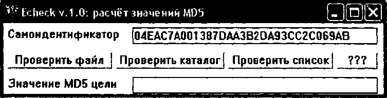 Утилита для вычисления значений хэш-функции MD5 (RFC 1321) Echeck v. 1.0 (самойдентификатор MD 5: 04EAC7A001387DAA3B2DA93CC2C069AB) |