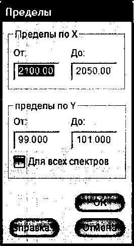 С помощью команд меню «Вид» => «Пределы» установить диапазон по волновым числам для измерения шума в области спектра от 2100 до 2050 см'1 (от 6500 до 5800 см'1 для модели iS5N). Вид окна «Пределы» показан на рисунке 3.