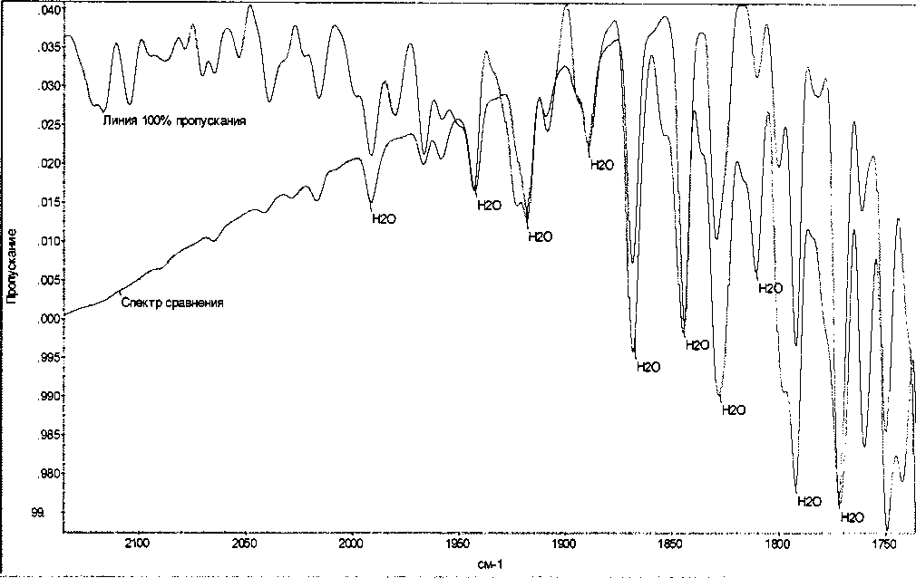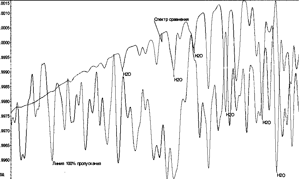 При регистрации спектра необходимо убедиться, что в спектре линии 100% пропускания отсутствуют полосы поглощения атмосферных газов. Для этого в то же окно выводится однолучевой спектр сравнения (меню Измерение-Просмотр спектра сравнения). В спектре линии 100% пропускания не должно наблюдаться линий, коррелирующих с полосами атмосферных газов (спектры приведены в Приложении 1). В случае наличия указанных полос поглощения необходимо плотно закрыть крышку кюветного отделения, выждать время, необходимое для стабилизации атмосферы в оптическом блоке и повторить измерение.