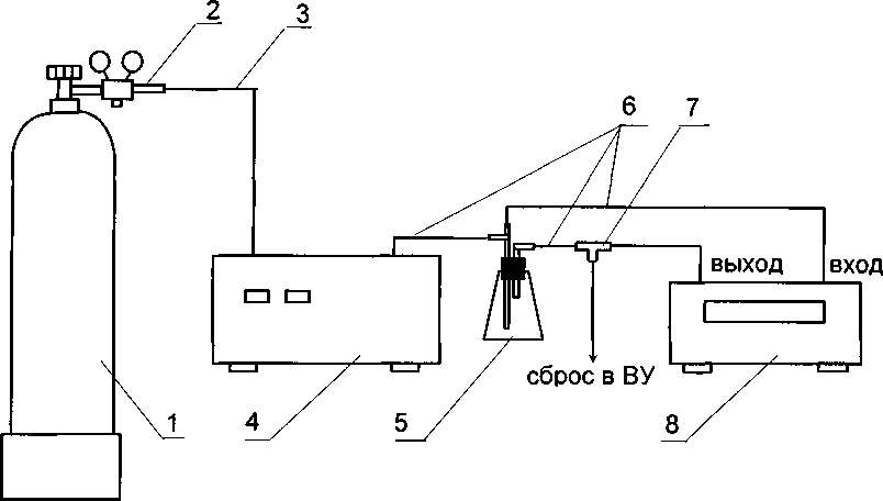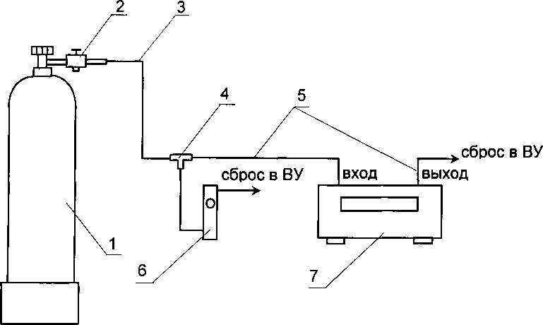 5 - трубка фторопластовая; 6 - ротаметр; 7 - газоанализатор; ВУ - вытяжное устройство