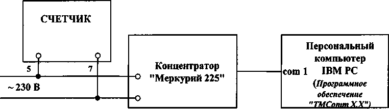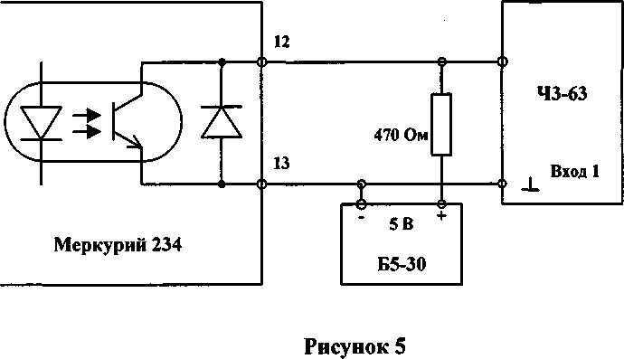 Подключить счётчик к компьютеру. Импульсный выход счётчика (контакты 12, 13) подключить к частотомеру согласно рисунка 5. С помощью программы «Конфигуратор счётчиков Меркурий» перевести импульсный выход счётчика в режим «Тест 0.5 Гц».