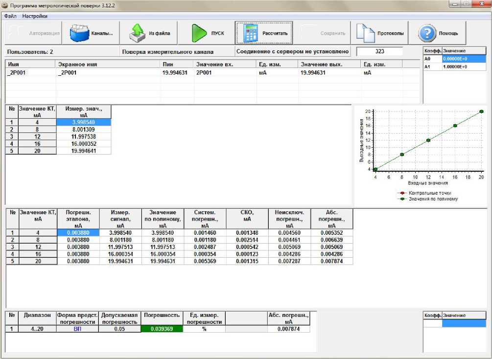 Исходными данными для расчета МХ ИК являются выходные сигналы ИК, представляемые в виде массивов чисел yik , полученные при подаче на вход поверяемого ИК входных величин xi , контролируемых по рабочему эталону, где i - индекс номера контрольной точки; k - индекс номера отсчета в контрольной точке.