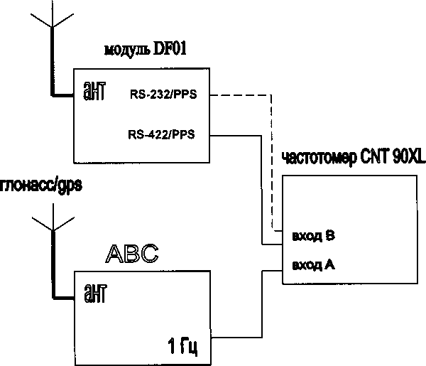5.3.2 Определение абсолютной погрешности привязки выходного сигнала 1 Гц (1 PPS), выдаваемого модулем по интерфейсу RS-232/PPS, к шкале времени UTC(SU)Для определения абсолютной погрешности привязки выходного сигнала 1 Гц (1 PPS), выдаваемого по интерфейсу RS-232/PPS, к шкале времени UTC(SU) собрать схему аналогичную рисунку 1 и присоединить кабелем контакты разъема «RS-422/PPS» модуля «DF01» к входу частотомера CNT-90 XL.
