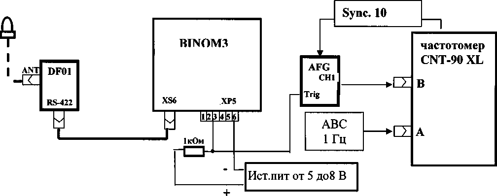 Присоединить кабелем контакты разъема «RS-422/PPS» модуля «DF01» к входу В частотомера CNT-90 XL. Соединить выход «1Гц» синхронизирующего приемника с входом А частотомера CNT-90 XL. Если результаты измерений близки к 1 с, поменять входы CNT-90 XL и знак погрешности.