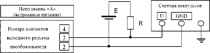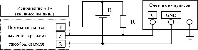 Для точного определения относительной погрешности используется поверочный выход с ценой импульса равной 1/100 от цены импульса основного выхода. Подсчет импульсов с поверочного выхода при испытаниях осуществляется при помощи электронного счетчика импульсов. Электрическая схема подключения преобразователя при испытаниях в зависимости от условного кода исполнения преобразователя согласно рис. 1, рис. 2.
