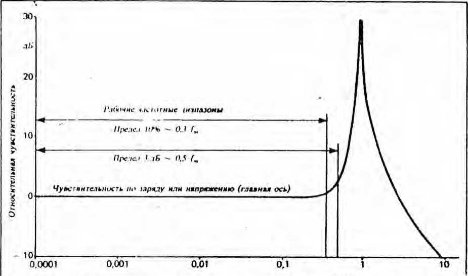 Предел 5 % определен частотой, на которой относительное отклонение, получаемого в результате измерения значения амплитуды от действительного значения амплитуды, воздействующих на датчик механических колебаний, составляет 5 %. С непревышающей 5 % погрешностью можно измерять механические колебания с частотами, меньшими приблизительно деленного на 5 (коэффициент умножения 0.22) значения резонансной частоты закрепленного датчика. Снизу частотный диапазон ограничен фильтром верхних частот усилителя заряда.