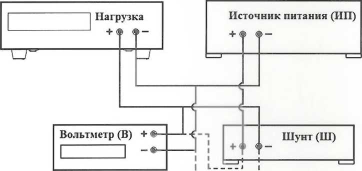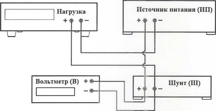 8 При помощи шунта и вольтметра вычисляют ток, протекающий через нагрузку 1действ. по формуле (1) (вольтметр подключают к клеммам шунта).