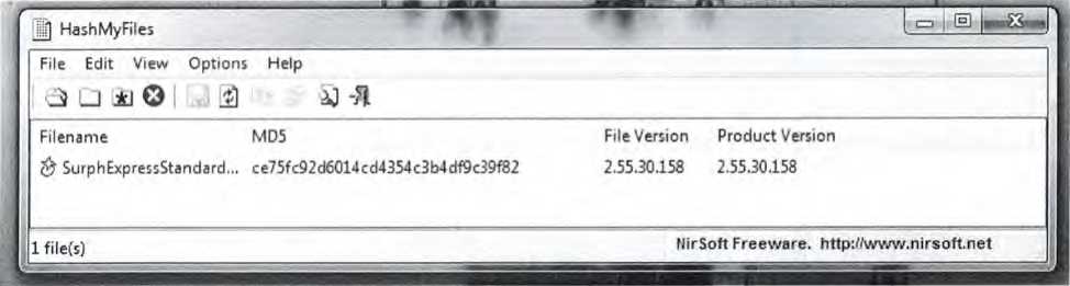 7.2.4 Определить цифровой идентификатор ПО «SurphExpressStandart» при помощи утилиты HashMyFiles по алгоритму MD5 (см. рис. 3).