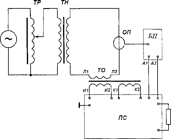 ~ - сеть (генератор); ТР - регулирующее устройство (автотрансформатор); ТН-понижающий силовой трансформатор; ТО - эталонный трансформатор тока; БП - блок преобразовательный ЭОТТ; ОП - гибкий чувствительный элемент ЭОТТ; Л1, Л2 -контактные зажимы первичной обмотки; И1, И2 - контактные зажимы вторичной обмотки; KI, К2 - контактные зажимы дополнительной вторичной обмотки; Al, А2 -аналоговый выход ЭОТТ; Z - нагрузка; ПС - прибор сравнения токов КНТ-05