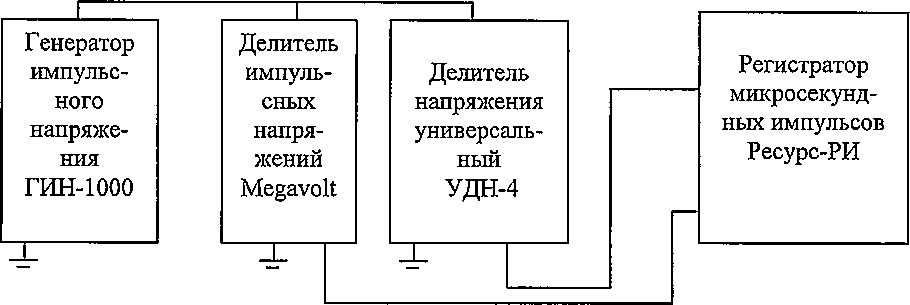 1 - Заряжающий генератор от ГИН-5000; 2 - Делитель напряжения ДН-100э; 3 - Вольтметр амплитудный постоянного и переменного токаВА-3.1; 4 - Регистратор микросекундных импульсов Ресурс-РИ