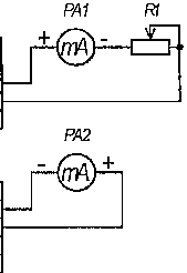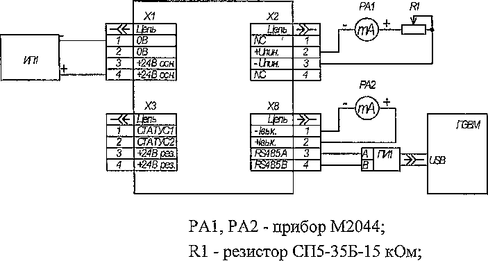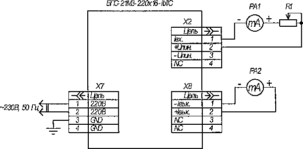 При помощи резистора R1 установить последовательно входной ток по показаниям прибора РА1 равным (4,00±0,02) мА, (12,00±0,06) мА, (20,0±0,1) мА. При каждом значении входного тока регистрировать выходной ток по показаниям прибора РА2.