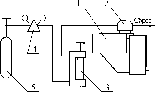1- газоанализатор; 2 - насадка; 3 - ротаметр РМ-А-0,063, 4 - редуктор (регулятор расхода поверочной газовой смеси) ДПК 1,65; 5 - баллон с поверочной газовой смесью.