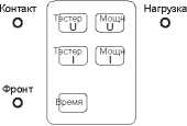 - Включить режим «Время» кнопкой клавиатуры. На индикаторе появится надпись «Время срабатывания». Включить переключатель «Нагрузка». После срабатывания реле должен загореться светодиод «Контакт», а на индикаторе высветится надпись «tc= ХХ.ХХ с».