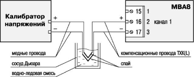Прибор для поверки вольтметров дифференциальный вольтметр В1-12 Компаратор напряжения Р 3003 или Калибратор напряжения П320 Калибратор тока П 321 Магазин сопротивлений Р4831. ГОСТ 23737-79 Вольтметр универсальный В7-53/1 Секундомер СОПпр-2а-2-010 (Мегомметр М4100/1, 100В) (Мегомметр М4100/3, 500В) Частотомер ЧЗ-63 Термометр ТЛ-4 Барометр-анероид М-67. ТУ 250-1797-75 Психрометр МВ-4М. ТУ 2516-07-054-85 Адаптер интерфейса АС3 (предприятие-изготовитель «ПО ОВЕН») IBM-совместимый компьютер с установленной программой «Конфигуратор МВА8» Компенсационные термоэлектродные провода Сосуд Дьюара или термостат нулевой температуры |