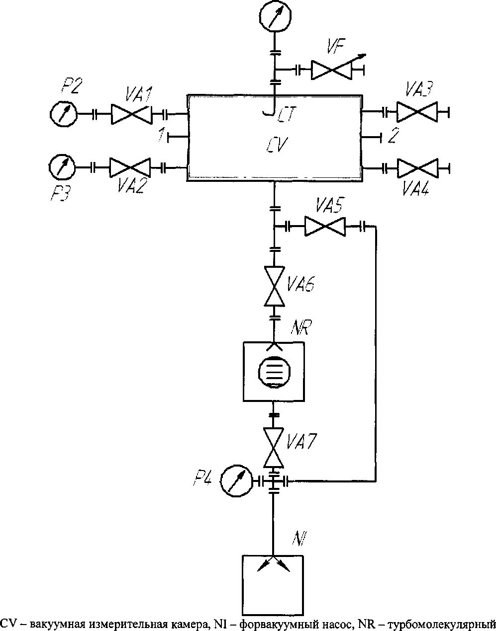 насос пЕХТ 300, Р1 - индикаторный тепловой вакуумметр CVM 211, Р2 - вакуумметр деформационно-термопарный эталонный 2-го разряда ВДТО-3, РЗ - вакуумметр ионизационный 2-го разряда AIGX, Р4 - индикаторный вакуумметр сопротивления APG, VF - высокоточный натекатель, VA1-VA7 - вакуумные клапаны, 1 и 2 - порты для присоединения дополнительного оборудования (приборов контроля герметичности, дополнительных откачиваемых объемов и откачных средств, и т.д.)