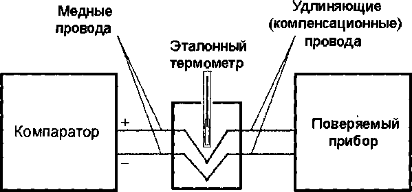 а) К клеммам поверяемого прибора подключают удлиняющие (компенсационные) провода по ГОСТ 1790-77, ГОСТ 1791-67 к ТП (в соответствии с требованиями по ГОСТ 8.338-2002). Тип компенсационных проводов должен соответствовать типу НСХ установленному на приборе. Концы удлиняющих проводов соединяют с медными проводами, скрутки проводов помещают в пробирки заполненные маслом, а затем пробирки помещают в нулевой термостат (или сосуд Дьюара, заполненный льдо-водяной смесью). Температуру в сосуде Дьюара контролируют термометром с пределом допускаемой абсолютной погрешности не более ±0,05 °C.