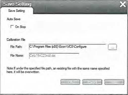 The calibration file <C:\Program Files (x86)\Econ\VCS\Configure\Calb194023449 dab already exists. Would you like to overwrite? The old calibration file wiH be overwrtten if press Yes', it wont save calibration file if press ‘No'.