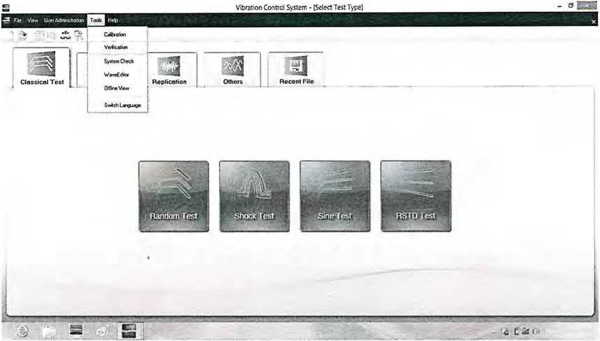 Поверка производится по измерению параметров входного сигнала входными каналами аппаратуры. Все характеристики вибрации (виброускорение, виброскорость, виброперемещение) определяются аппаратурой путём пересчёта параметров входного сигнала (амплитуда и частота). Поверка выполняется в полуавтоматическом режиме под управлением специальной подпрограммы. Подпрограмма запускается из основного меню программы управления виброиспытаниями VCSTest выбором пункта Verification (Поверка) в разделе Tools (Инструменты) (рис. 1).