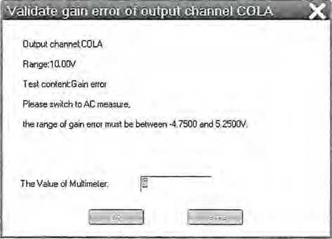7.3.10. Установить режим вольтметра для измерений СКЗ переменного напряжения (AC V). Для подтверждения переменного напряжения канала COLA ввести измеренное значение в соответствующее поле окна программы. Подтвердить ввод нажатием кнопки Ок.
