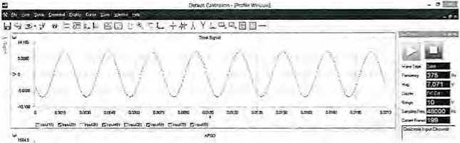 Поверка входных каналов начинается автоматически по завершении поверки выходных каналов. Рабочий экран разделен на две части по горизонтали. В верхней части выводятся временные сигналы входных каналов, в нижней части графики спектральных плотностей.