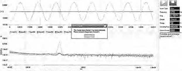 Аналогично поверке каналов с входами по напряжению, на первом шаге поверки по заряду производится вычисление корректирующих (калибровочных) коэффициентов (сообщение Calibrate gain of charge input channel X). На втором шаге производится подтверждение показаний канала (сообщение Validate gain of charge input channel X).