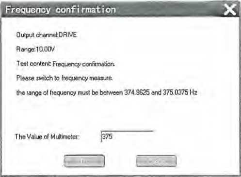 По завершении поверки всех каналов с зарядовыми входами, установить режим мультиметра для измерений частоты входного сигнала. Выходное переменное напряжение контроллера генерируется встроенным генератором на частоте 375 Гц. Зафиксировать показания частоты, измеренное мультиметром значение частоты должно лежать в пределах 374,9625 - 375,0375 Гц. Ввести измеренное значение частоты для подтверждения частоты выходного сигнала в соответствующее поле окна программы.