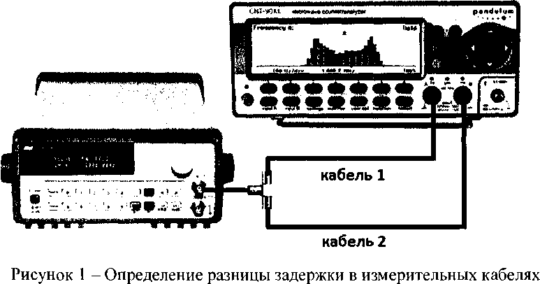 7.6.3 Перед проведением измерений определить разницу задержки в измерительных кабелях do. Для этого собрать схему, представленную на рисунке 1 (Выход генератора с регулируемыми параметрами подключить через тройник кабелем 1 - ко входу А частотомера и кабелем 2 - ко входу В частотомера)