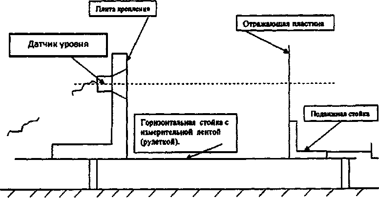 Если датчик уровня поверяется с помощью измерительной рулетки, то его монтируют на специальной подставке (рис. 2). В качестве имитатора поверхности измеряемой среды, должна использоваться отражающая поверхность, выполненная из металла (стали, дюраля или латуни), либо дерева размером не менее 800x800 мм.