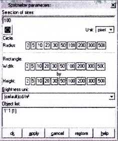 Расположить на светящейся области источника яркости точки для измерения. Для этого открыть вкладку «Spotmeter parameters» как показано на рисунке 6 и выбрать количество (10) и размер точек для измерения (радиус точки - 100 пикселей). Нажать клавишу «F8» для фиксации изображения.