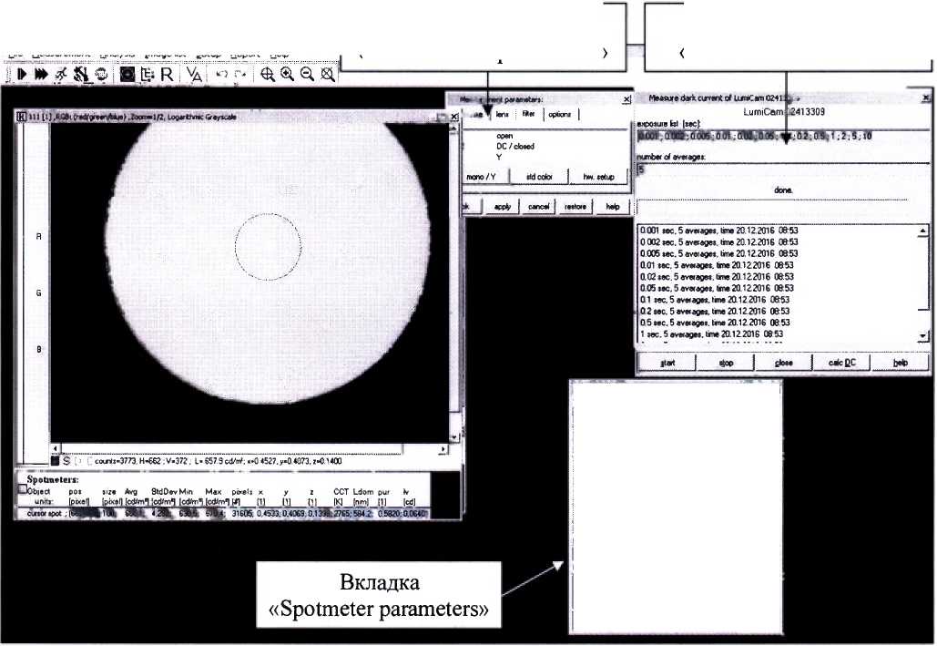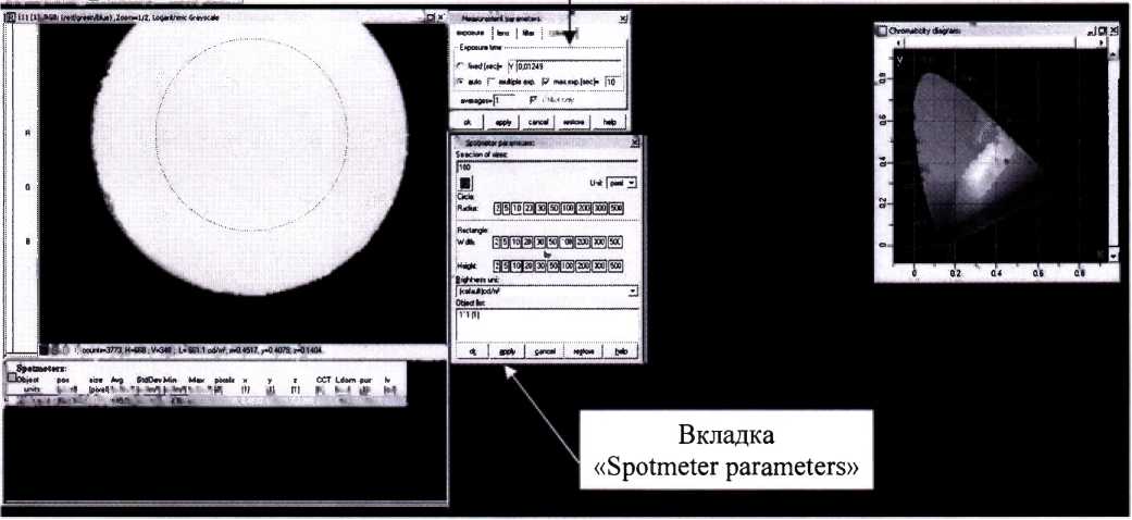 Расположить на светящейся области источника яркости точки для измерения. Для этого открыть вкладку «Spotmeter parameters» как показано на рисунке 7 и выбрать количество (10) и размер точек измерения (радиус точки - 100 пикселей). Нажать клавишу «F8» для фиксации изображения.