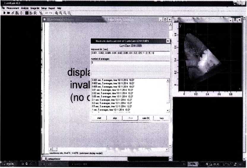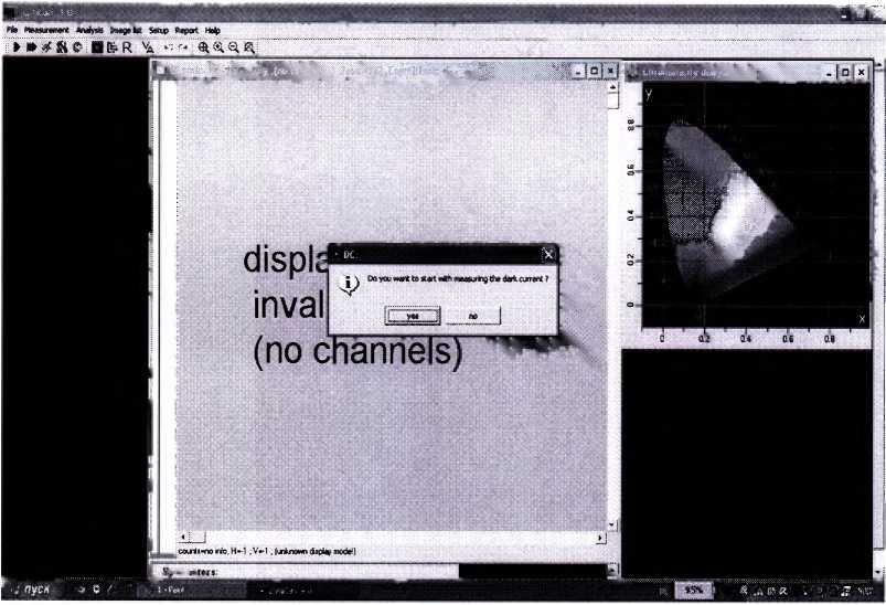 Будет предложено провести калибровку темнового тока, нажать в появившемся окне кнопку «Yes» в соответствии с рисунком 4. В открывшемся окне «Measure dark current» нажать кнопку «Start», предварительно убедившись, что объектив закрыт защитной крышкой. После завершения калибровки темнового тока нажать кнопку «Close» как показано на рисунке 5.