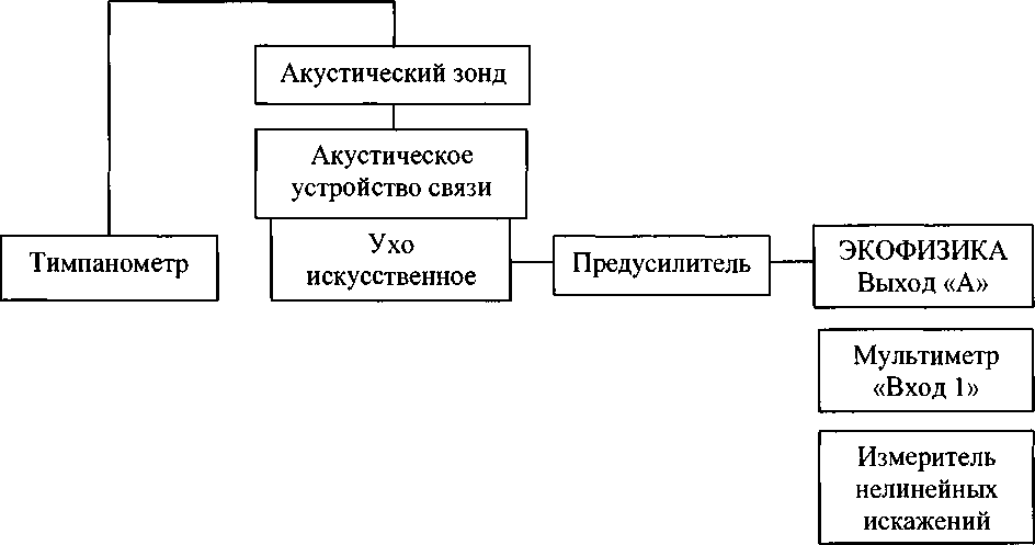 8.3.2.1 Собрать схему в соответствии с рисунком 2 с использованием искусственного уха 4152, акустического устройства связи, акустического зонда, мультиметра 3458 в режиме «частотомер», подключаемого к выходу «А» измерителя акустического многофункционального ЭКОФИЗИКА.