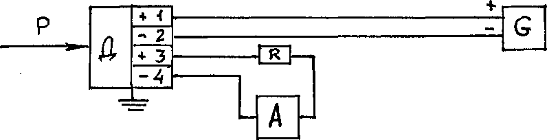 Схема 4 включения датчика с аналоговым выходным сигналом постоянного тока 0-5 мА или 0-20 мА при измерении выходного сигнала по падению напряжения на эталонном сопротивлении.