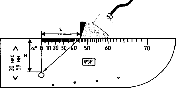 А - расстояние от точки выхода преобразователя до передней грани призмы, мм, L - координата от передней грани призмы до проекции дефекта на поверхность