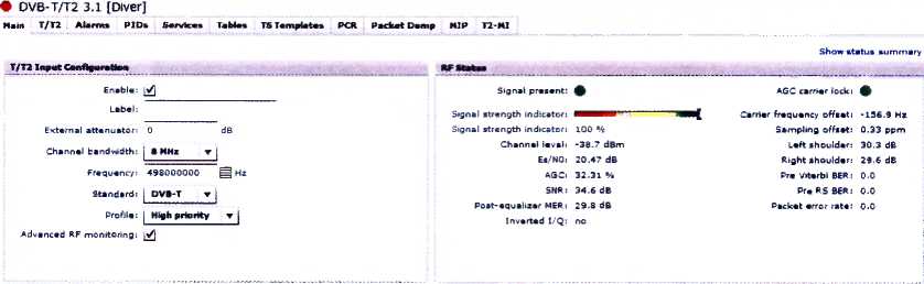 Выбрать закладку "RF" в окне "Settings", задать частоту 500 МГц, нажать кнопку start (начать измерения). Затем выбрать плагин "Monitoring" и провести измерения MER по точкам в соответствии с таблицей 6.