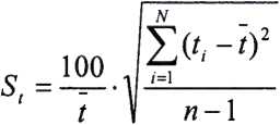 6.4.3.2. Относительное СКО выходного сигнала (Sr- по площади пика и St- по времени удерживания), выраженное в процентах, рассчитывают по формулам (4) и (5) соответственно.