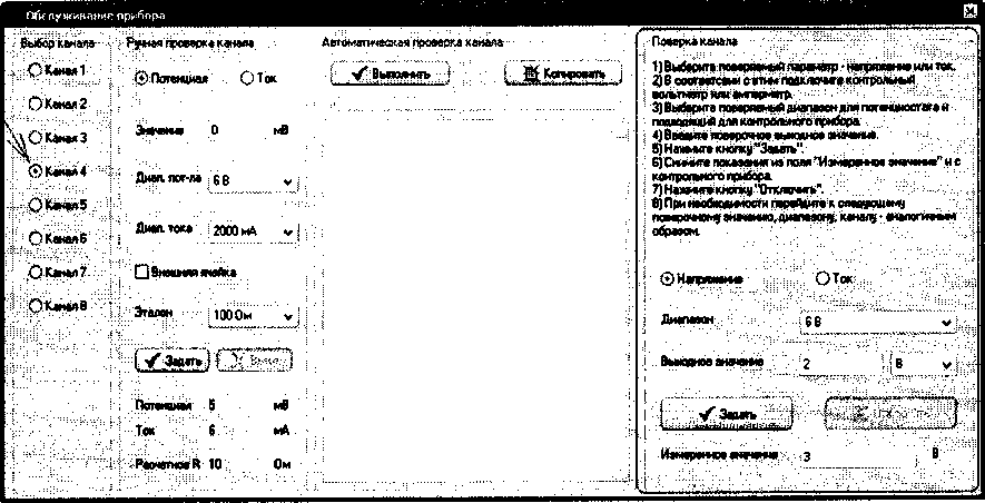А.7 Для проведения проверки необходимо выбрать проверяемый канал прибора (в случае многоканального прибора) в левой части этого окна.
