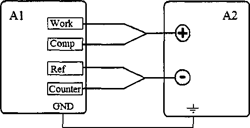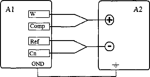 2) подключить к первому каналу прибора амперметр. Подключение производить следующим образом: выходы W и Comp прибора подключить к положительному входу амперметра, выходы Ref и Сп - вместе к отрицательному (см. приложение Б);