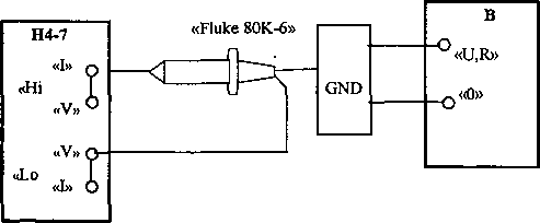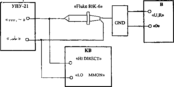 Fluke 80К.-6, GND - щуп высоковольтный из комплекта поверяемого вольтметра; В - поверяемый вольтметр.