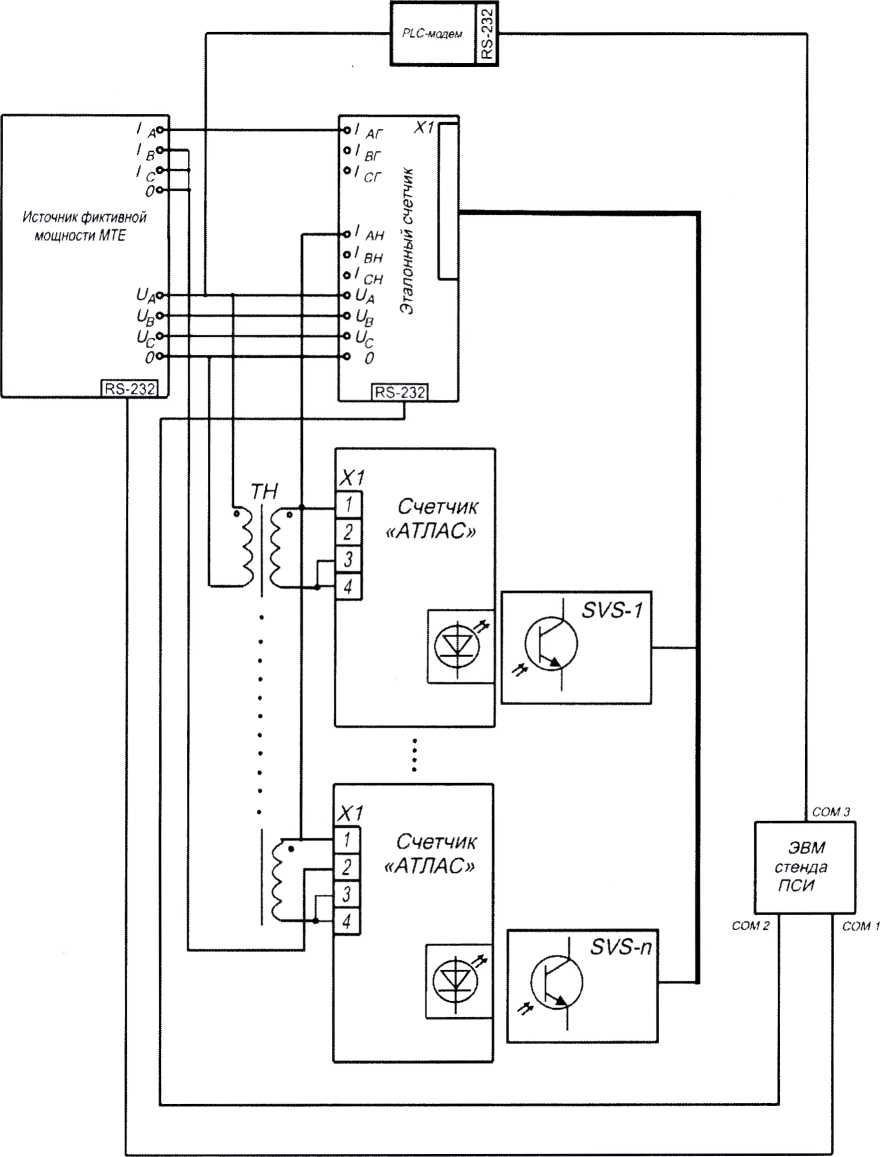 Рисунок 2 - Схема стенда для проверки основных погрешностей измерений активной и реактивной электрической энергии, активной и реактивной электрической мощности, напряжения переменного тока, силы переменного тока, частоты переменного тока, проверки порога чувствительности (стартового тока)