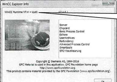 При выполнении запроса на экране монитора рабочей станции, должна отразиться версия инженерного ПО STEP 7 - (V5.5+ SP4+HF9) и версия WinCC - (V7.4+Updl) указанные в описании типа данного СИ, см. рис. 1