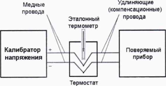 а) К поверяемому прибору подключают удлиняющие (компенсационные) провода по ГОСТ 1790-77, ГОСТ 1791-67 к ТП (в соответствии с требованиями по ГОСТ 8.338-2002). Тип компенсационных проводов должен соответствовать установленному типу НСХ по ГОСТ Р 8.585-2001 /МЭК 60584-1:2013. Концы удлиняющих проводов соединяют с медными проводами, скрутки проводов помещают в пробирки, заполненные трансформаторным маслом, а затем пробирки помещают в нулевой термостат (или сосуд Дьюара, заполненный льдоводяной смесью). Температуру в сосуде Дьюара контролируют термометром с пределом допускаемой абсолютной погрешности не более ±0.05 °C.
