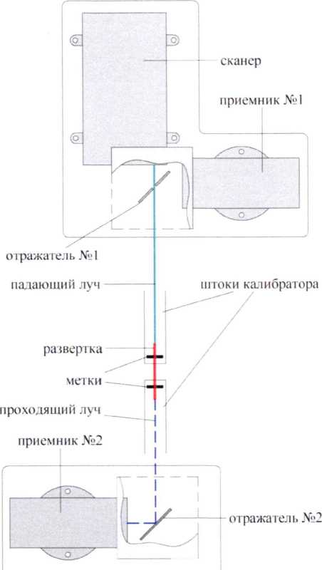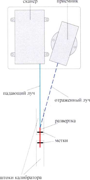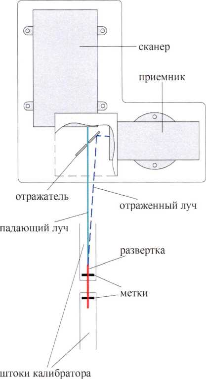 Калибратор и измеритель установить относительно друг друга таким образом, чтобы линия сканирования (развертка лазерного луча) освещала метки. При этом, развертка лазерного луча должна полностью перекрываться по ширине адаптерами и/или метками. Центр линии развёртки лазерного луча должен находиться в вертикальной плоскости, проходящей через середину расстояния между подвижным и неподвижным адаптерами, разведёнными до наибольшего предела измерений калибратора. При разведении адаптеров калибратора до наибольшего предела измерений на адаптеры калибратора с метками должен попадать свет лазерного луча. Контролировать правильность взаимного расположения измерителя и калибратора следует по форме и величине сигнала на приемнике в соответствии с требованиями раздела 2 руководства по эксплуатации на измеритель.