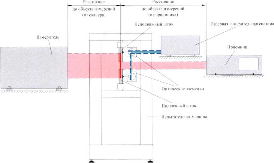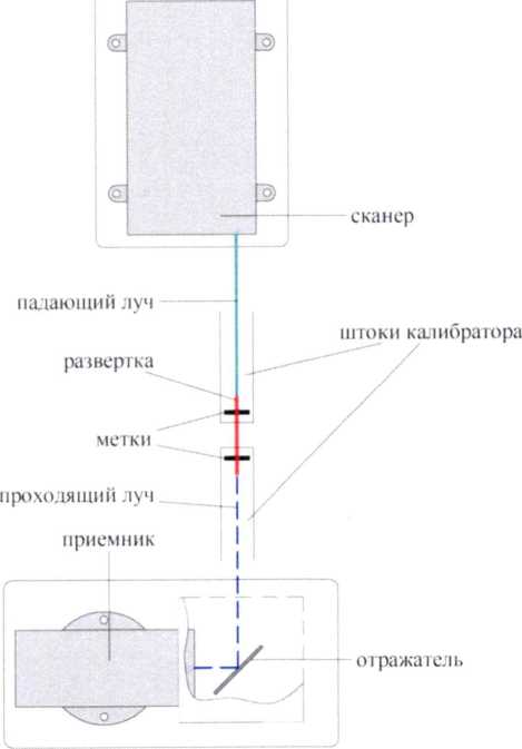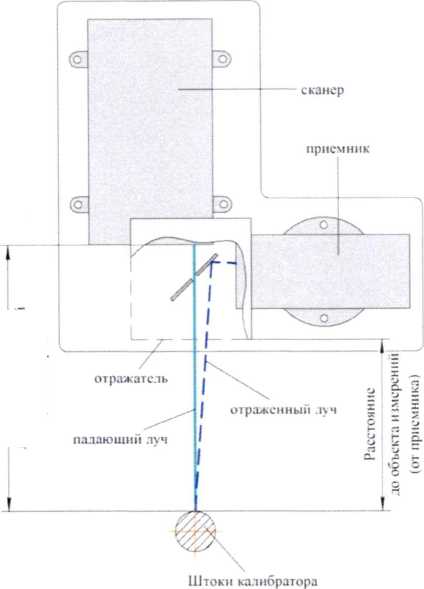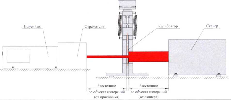 10.1.2. Установить измеритель и калибратор на общем основании. Сканер и калибратор установить на расстоянии до объекта измерений, равное расстоянию между фронтальной плоскостью сканера и штоками калибратора, которое с допускаемыми отклонениями указано в паспорте измерителя. В случае измерений на просвет приёмник установить относительно калибратора на расстоянии до объекта измерений равное расстоянию между фронтальной плоскостью приёмника (или отражателя при наличии) и штоками калибратора, которое с допустимыми отклонениями указанно в паспорте измерителя. Расстояние до объекта измерений контролировать с применением рулетки измерительной. Схемы определения расстояния до объекта измерений приведены в Приложении А.